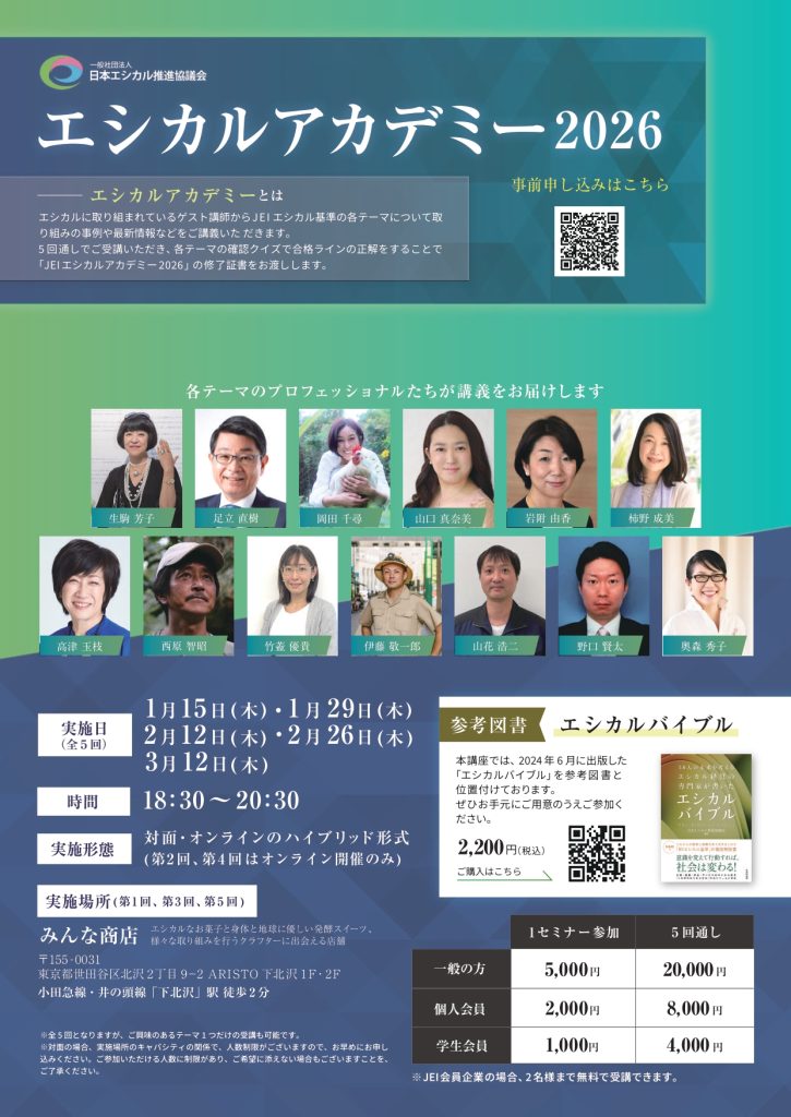 今年もJEIエシカルアカデミーを開催いたします。2024年6月に出版した「エシカルバイブル」を参考図書と位置付け、エシカルに取り組まれているゲスト講師からJEIエシカル基準の各テーマについて取り組みの事例や最新情報などをご紹介いただきます。