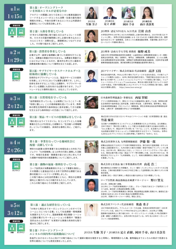 <第1回> 1月15日(木) 対面&オンライン・第1部:オープニング:エシカルとは、何故エシカルなのか生駒芳子:JEI会長、ファッションジャーナリスト、HIRUMEプロデューサー足立直樹:JEI副会長および基準策定WGリーダー、持続可能な調達、サスティナビリティ経営のコンサル山口真奈美:JEI副会長、日本サステナブル・ラベル協会代表理事岡田千尋:JEI副会長、アニマルライツセンター代表 アニマルウェルフェアを推進・第2部 人権を尊重している岩附由香:JEI理事、認定NPO法人ACE代表